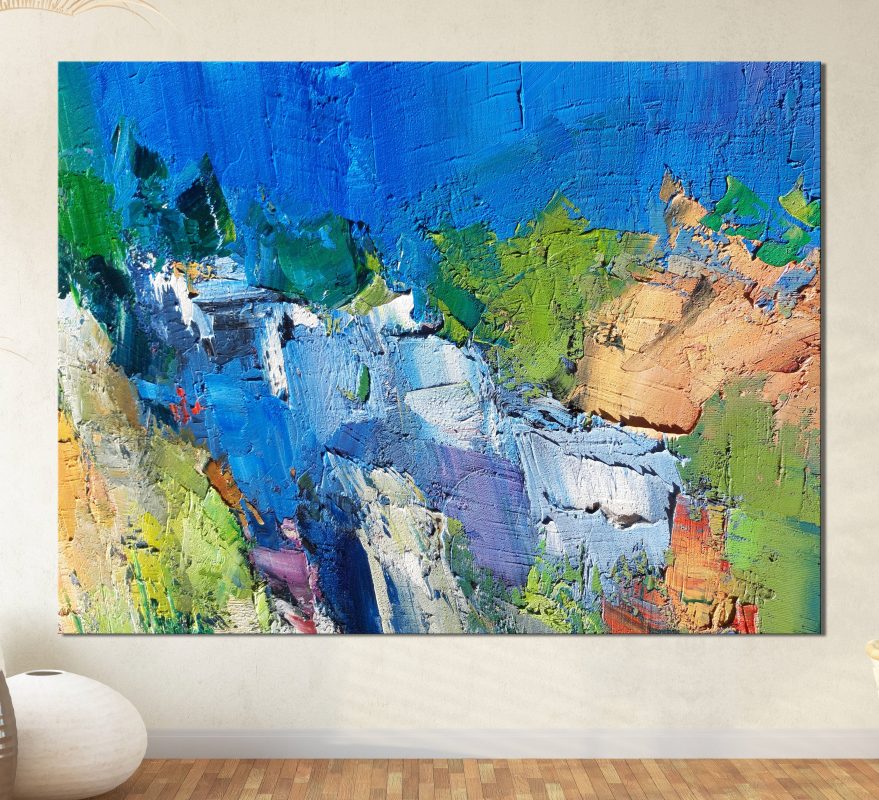 Colori di roccia, terra e vegetazione; tecnica mista su tela, cm. 70×100. Dipinto unico.