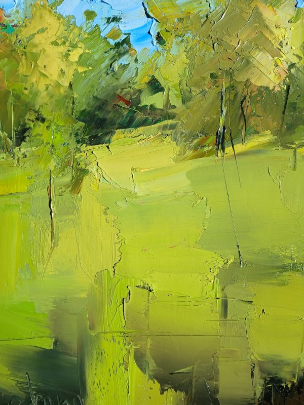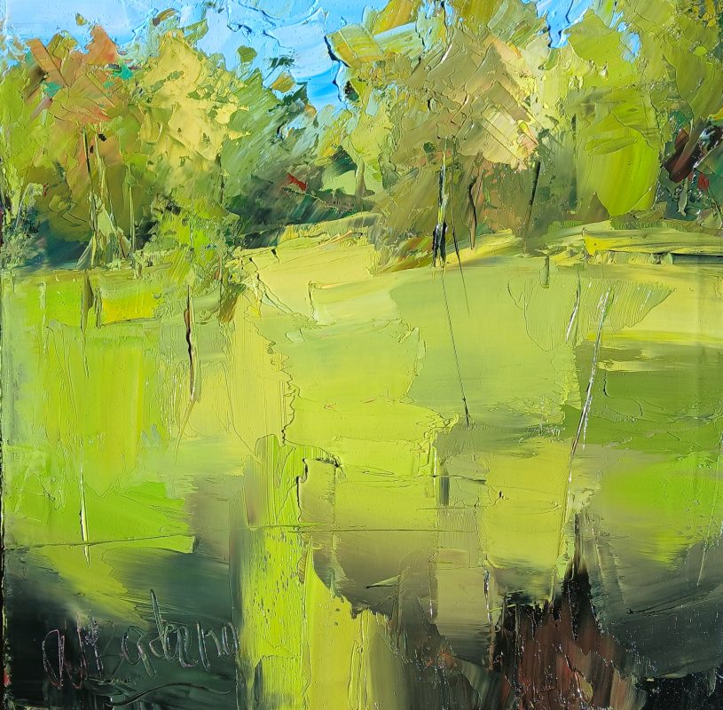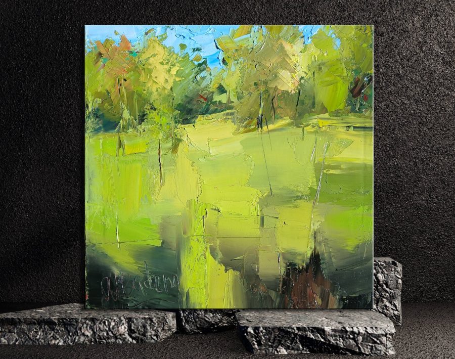 Elegante dipinto di medie dimensioni raffigurante una radura con colori di fine estate, verdi chiari e tendenti alla tinta ocra. Olio su tela, cm.50×50, pezzo unico, pronto da appendere.